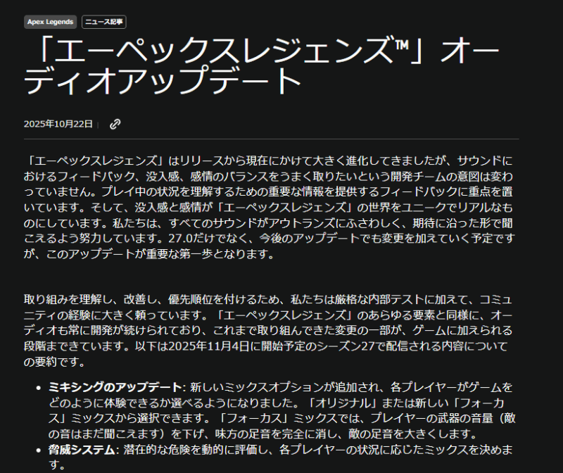 2025年11月、Apex公式から発表された「オーディオミキシングのアップデート」は、