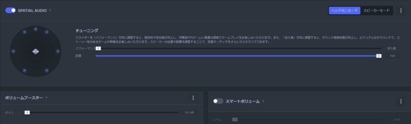 Sonarの「ゲーミング」タブを開き、この機能をオンにします。これで擬似的なサラウンド環境が構築されます。 - チューニングは「パフォーマンス」へ全振り スライダーを左側の「パフォーマンス」に振り切ってください。右側の「没入感」に振ってしまうと、映画のような反響音(リバーブ)が追加されてしまい、FPSでは音がぼやけて使い物にならなくなります。距離のスライダーは、広範囲の音を拾えるよう「100」推奨です。