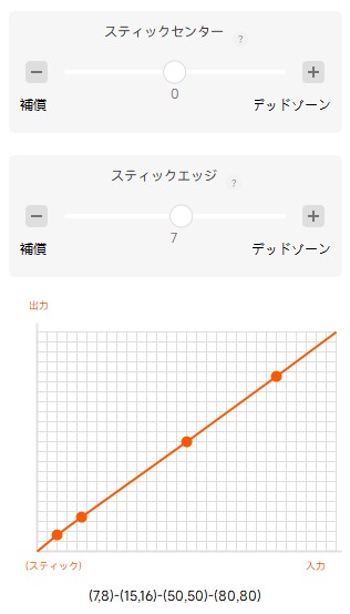 - エッジのデッドゾーン 7 の理由: 「遊びを削るのになぜプラスの7?」と思うかもしれませんが、これは「外側の7%を切り捨てる」という設定です。限界値を少し手前に持ってくることで、カスタムカーブで持ち上げた他の数値と綺麗に噛み合い、完璧な一直線(リニア)のバランスが完成します。