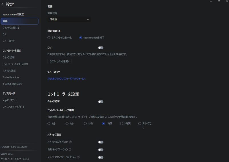 ログスイッチをONにするとFlydigi Space Stationはログファイル(動作記録)をPC上に生成し、このログにはソフトウェアや接続されたコントローラーの動作情報、PC環境(例:使用しているコンピュータモデルやCPUモデルなど)に関する情報が記録されるとのこと。